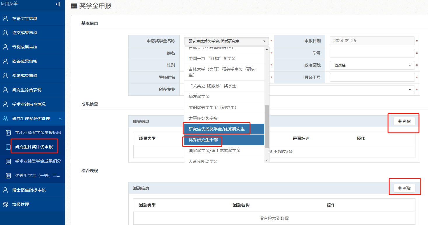 1、申报人请于10月13日前使用个人邮箱账号登录“一张表”平台(//one.heiliaobase.com),在“研究生评奖评优管理”-“研究生评奖评优申报”栏,点击【新增】进行【研究生优秀奖学金/优秀研究生】、【优秀研究生干部】申报信息填报,申报研究生优秀奖学金无需选择等级,依据综合得分由高到低自动定级;成果信息栏点击“新增”后输入“学号”,然后从已审核通过的成果库中选择不超过3篇代表作参评;综合表现—活动信息点击“新增”后输入“姓名或学号”,然后从已审核通过的活动中选择上一学年参与的活动。