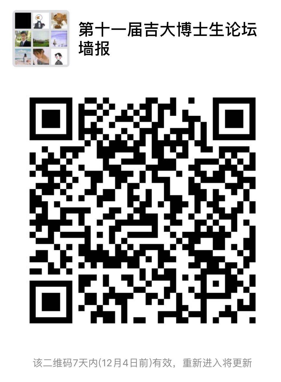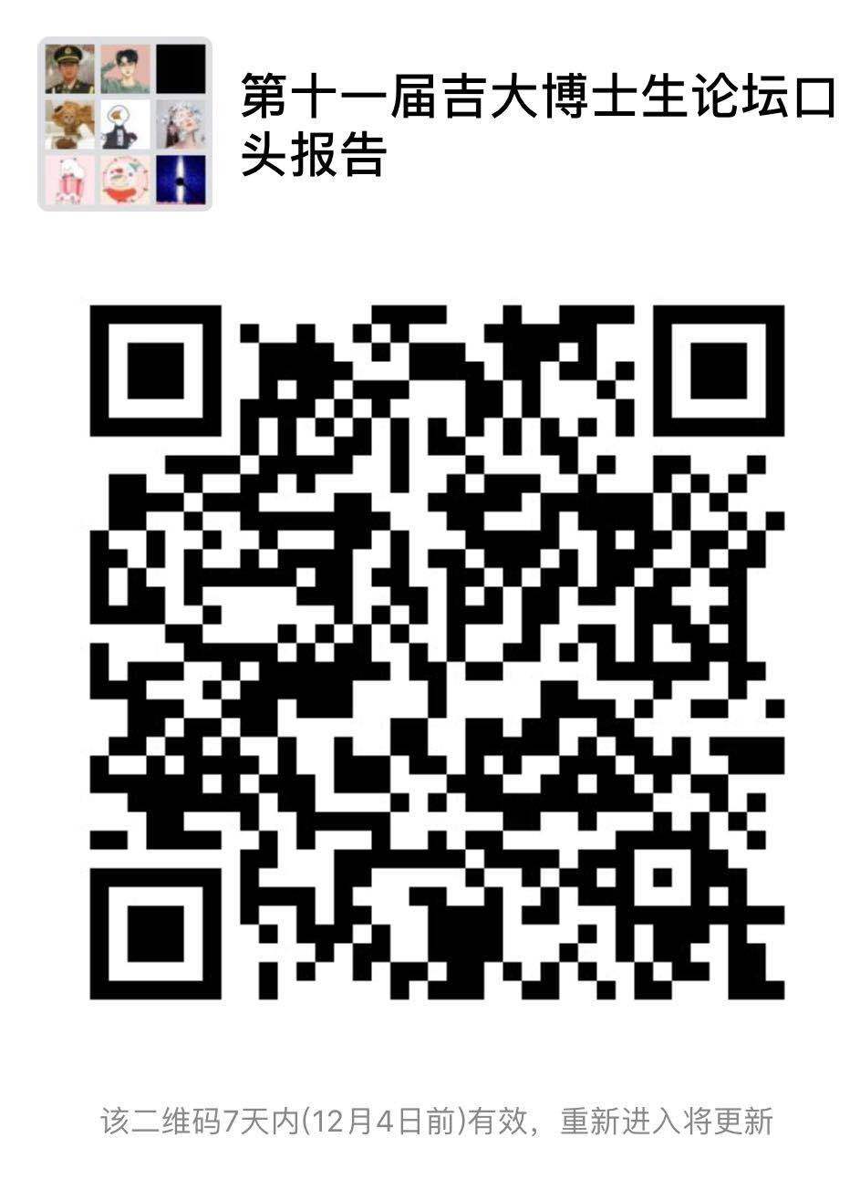 由吉林省科协、吉林省化学会、黑料正能量 研究生院研究生工作部联合举办的第十一届黑料正能量 博士生学术论坛暨第五届吉林省科协论坛将于12月6日、12月7日在黑料正能量 举办,经过初筛,参加口头报告及墙报报告的名单见附件一、附件二。请相关同学扫描以下二维码于11月27日18点前加入微信群(否则视为放弃参会),稍后将在微信群内发布下一轮会议通知。