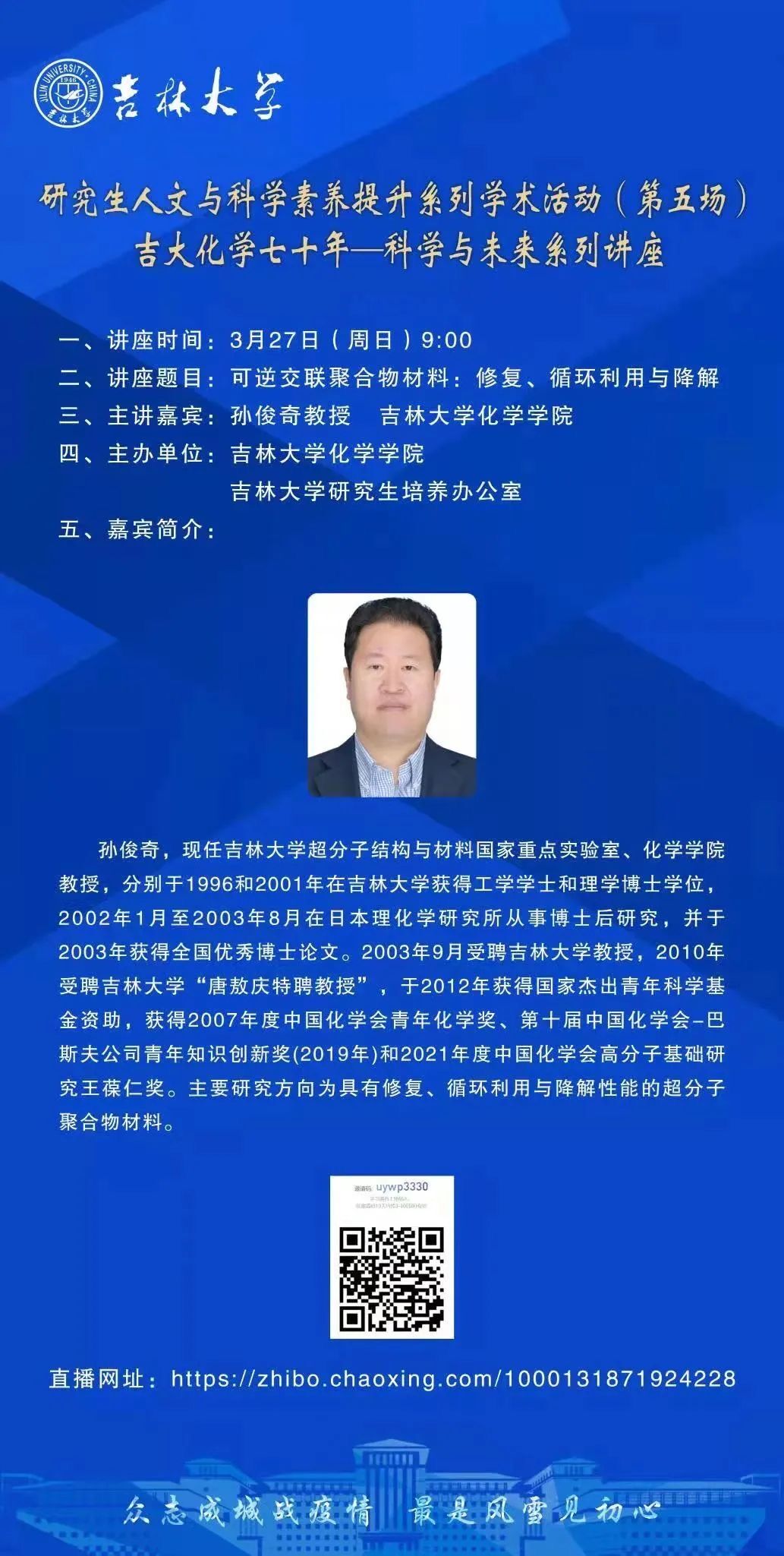 黑料正能量 化学70年院庆系列活动——科学与未来系列讲座:可逆交联聚合物材料:修复、循环利用与降解