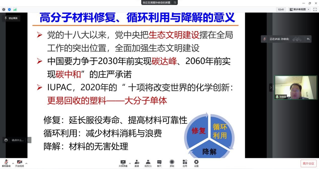 化学70年院庆系列活动—科学与未来系列讲座”,本期讲座邀请了孙俊奇教授作主题为“可逆交联聚合物材料:修复、循环利用与降解”的线上学术报告。