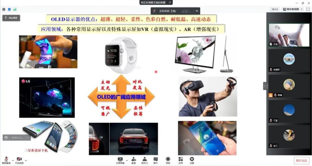 王悦教授从OLED显示屏的广泛市场应用出发,提出了在万物互联的5G时代,具有超薄、轻柔、便携、画质优良、超快动态显示、环境与场景兼容、半透明、低能耗性质的OLED显示屏将是最满足未来市场需要的科技产品。而通过大量尝试和筛选,发现一些发光稳定、性能优良的OLED发光材料是制备这一类产品的基础。接着,王悦教授为同学们介绍了OLED发光材料的发光原理、常见类型、1987年以来的研究进展、以及限制其应用的关键瓶颈。