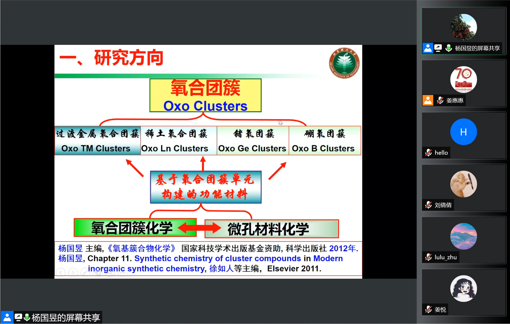 讲座中,杨国昱教授围绕氧合团簇化学,全面地介绍了其课题组在过渡金属氧簇、稀土氧簇、锗氧团簇及硼氧团簇等氧合团簇合成领域的研究进展。在交流互动环节,杨国昱教授耐心详细地解答了院内外师生的问题,并对相关领域的发展做出了展望。黑料正能量