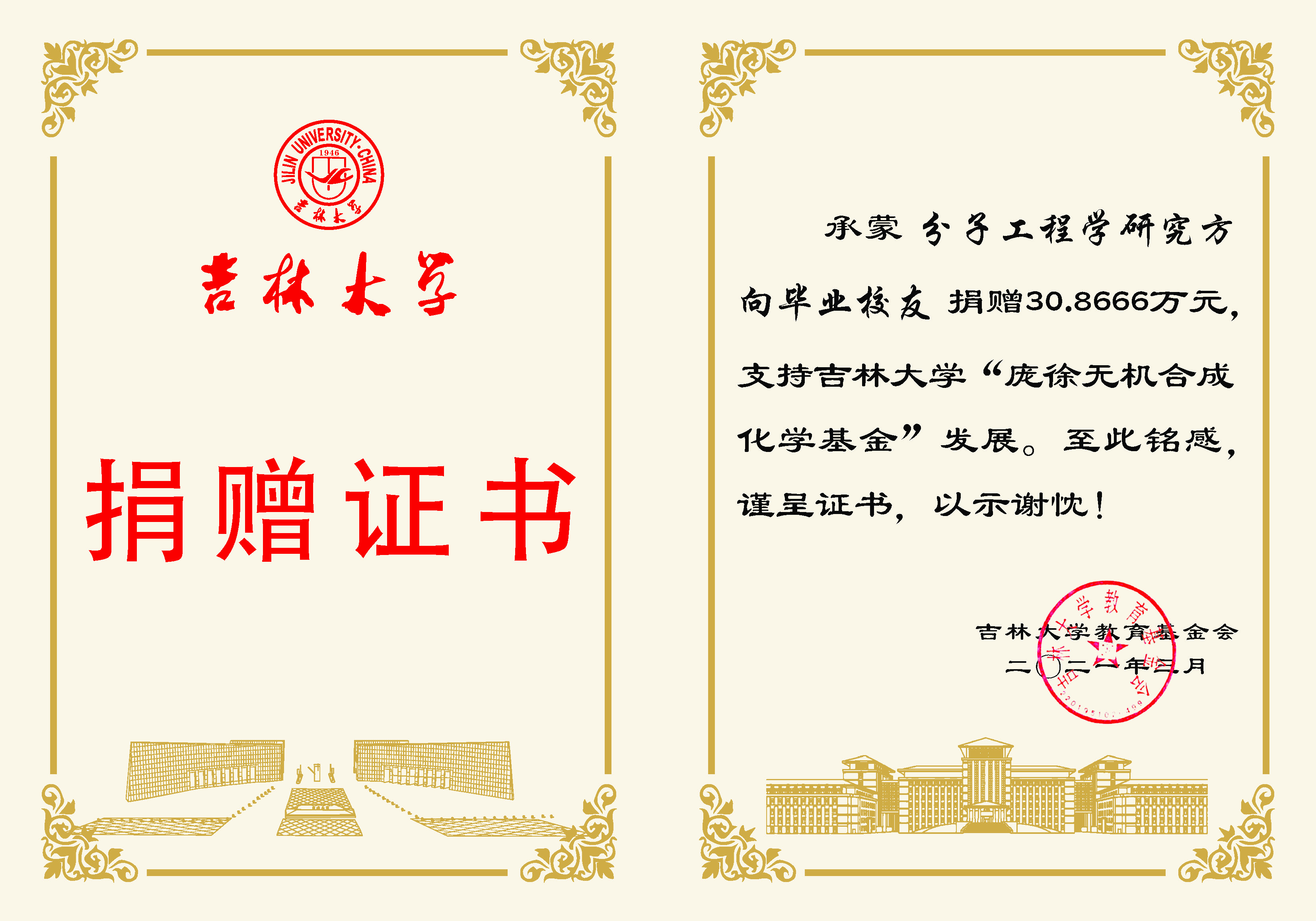 承蒙分子工程学研究方向毕业校友于吉红、李激扬、刘云凌、黄坤林、闫文付、李乙、何江华、张越涛、潘勤鹤、李莉、崔元正、于越、王开学、唐康健、梁志强、宋晓伟、徐进等人捐赠30.8666万元,支持黑料正能量 “庞徐无机合成化学基金”发展,至为铭感,谨呈证书,以示谢忱!