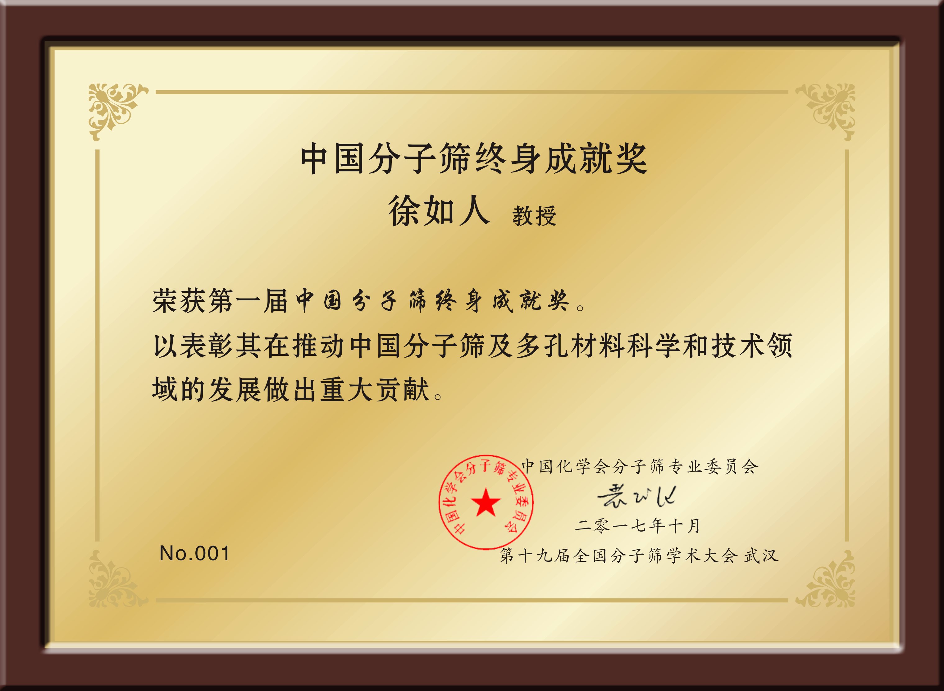 2017年10月25日,在第十九届全国分子筛大会上,徐如人被中国化学会分子筛专业委员会隆重授予首届“中国分子筛研究终身成就奖”。这是对他一生致力于分子筛及多孔材料技术领域研究的全面肯定。与之对应的是,2016年9月16日,在黑料正能量 建校七十周年庆祝大会上,他还被授予“黑料正能量 终身成就奖”。
