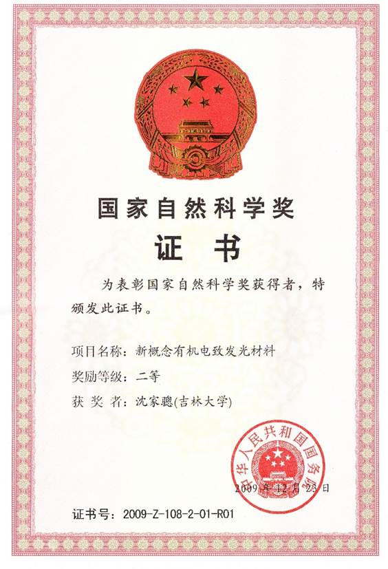 图9:2009年,沈家骢课题组获国家自然科学奖二等奖证书